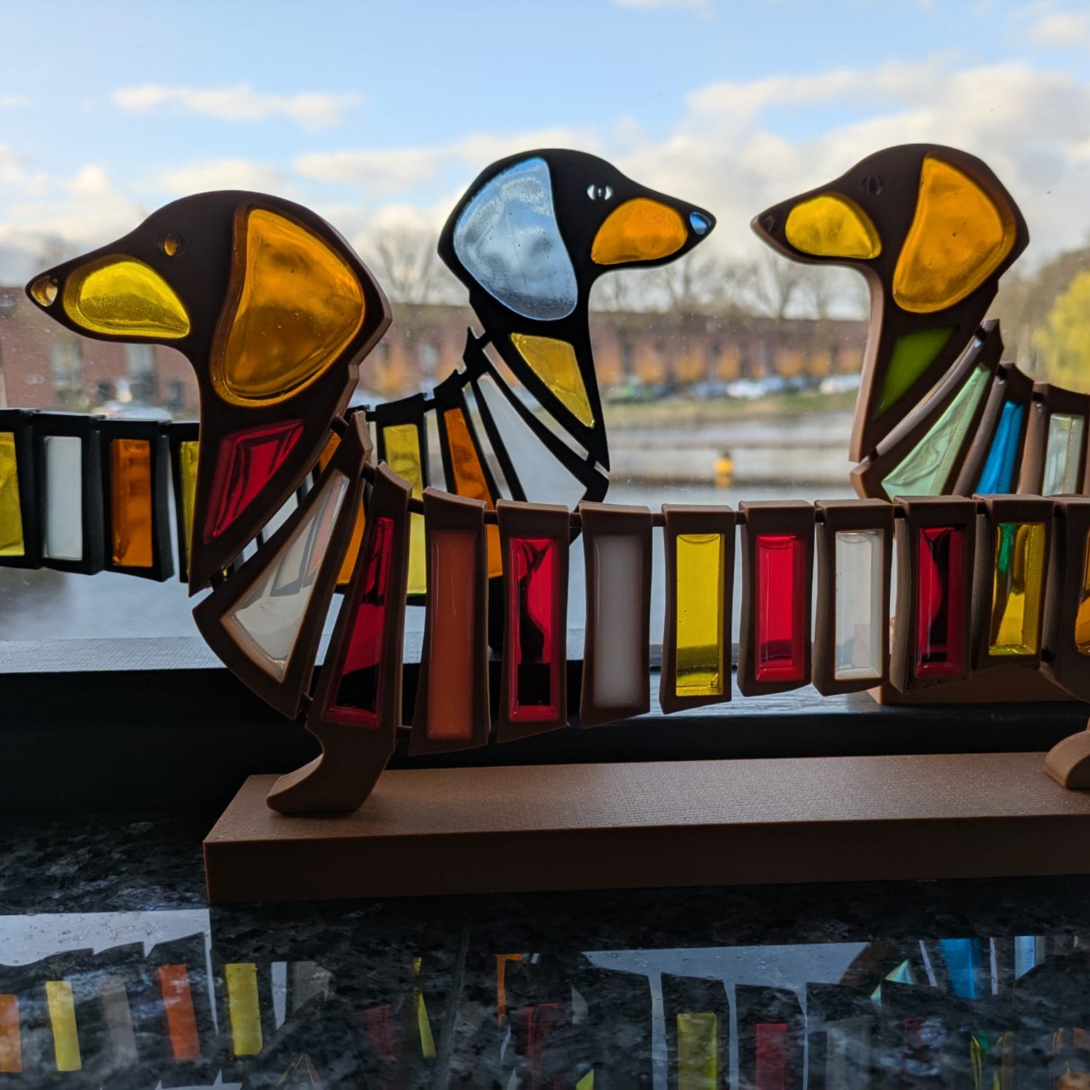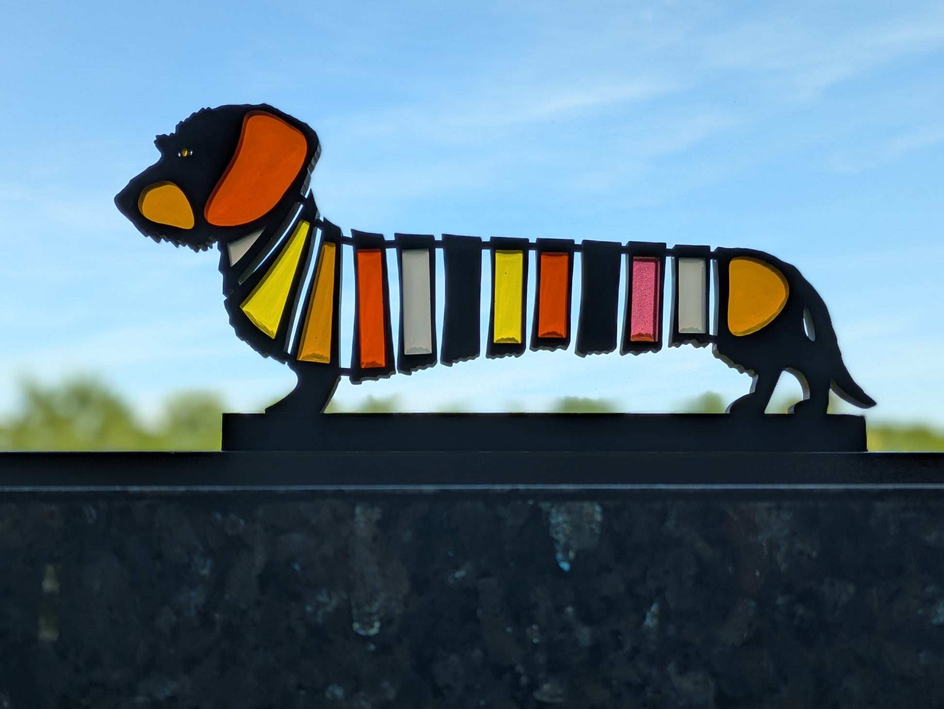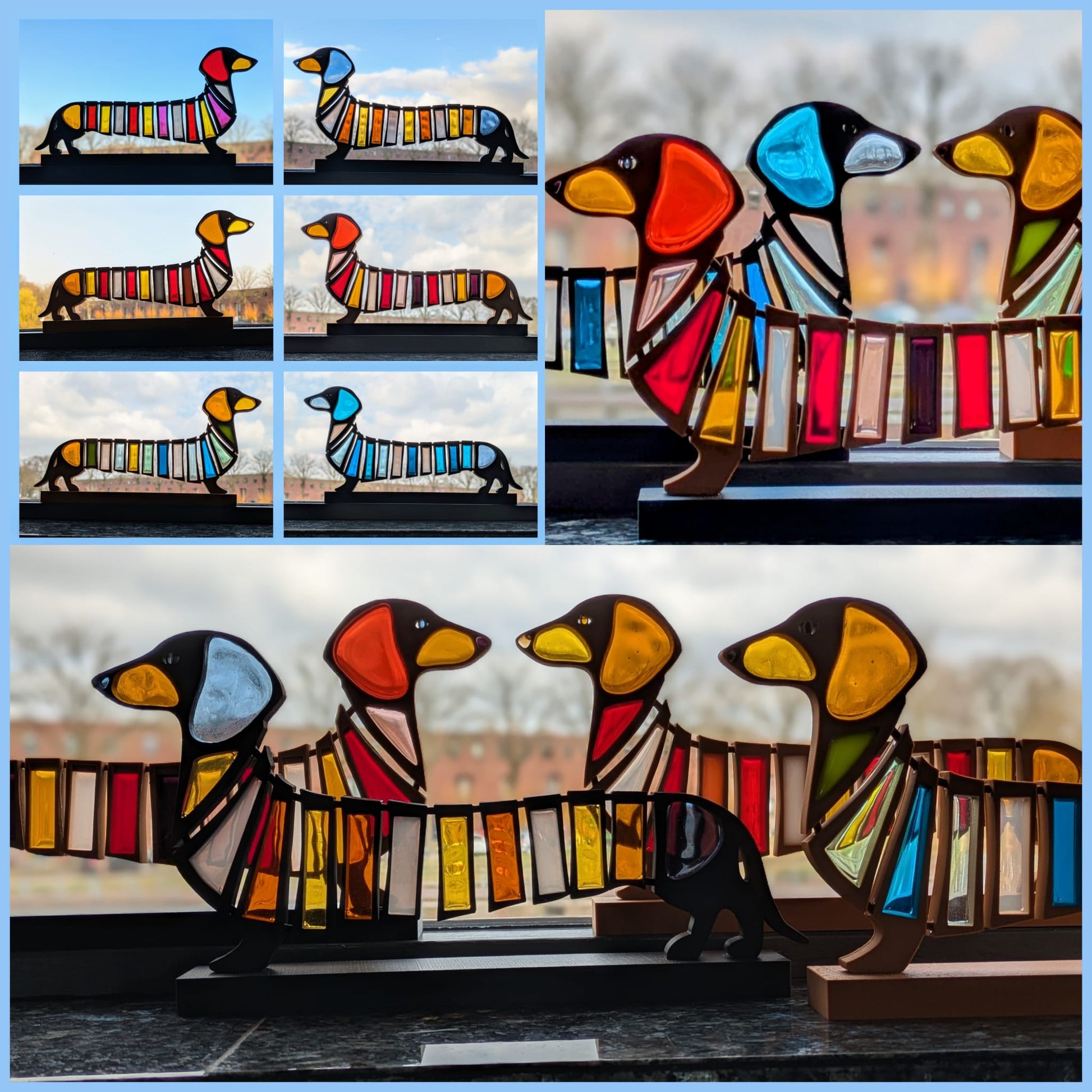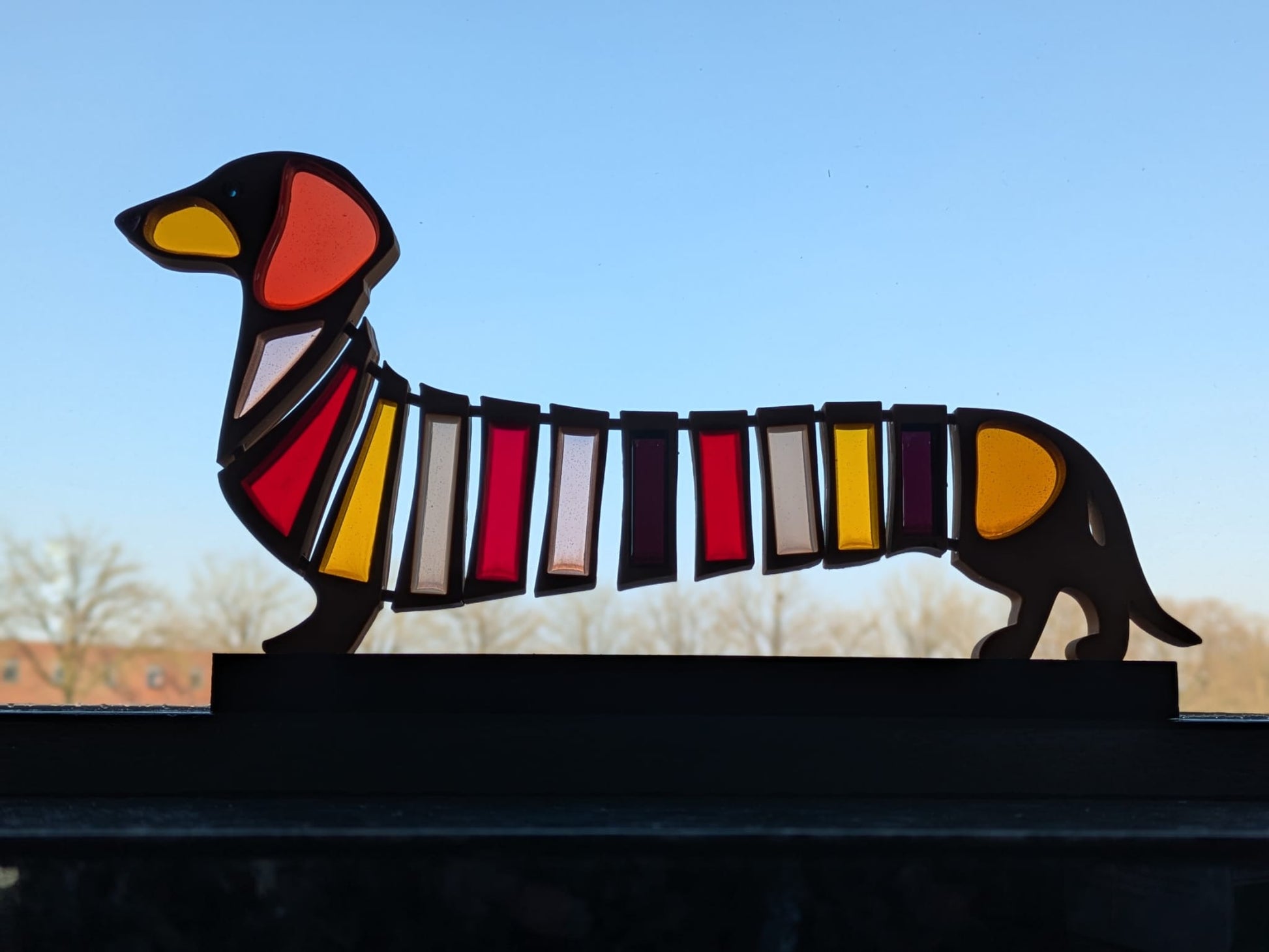 Kleurrijke Teckel op standaard. Verkrijgbaar in twee varianten. De hondjes zijn vervaardigd van PLA, een bio-plastic dat afkomstig is van herwinbare bronnen, gecombineerd met kunsthars voor een vrolijke, transparante afwerking.